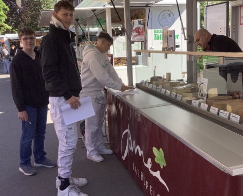 Der Kurs 8 SW und Frau Oeding besuchten den Hiltruper Wochenmarkt. Sie haben nicht ihren Wochenendeinkauf erledigt, sondern im Rahmen des Themas „Wirtschaft vor Ort“ Händler und Kunden interviewt. Die befragten Marktbesucher kamen alle aus Hiltrup und schätzten besonders die Regionalität der Waren und die netten Händler. Auch die Händler lobten die gute Atmosphäre des Marktes. Aber die Interviewten hatten auch Wünsche wie z.B. mehr Stände auf dem Markt. Für ein paar Schülerinnen gab es sogar Geschenke in Form von Rosen.