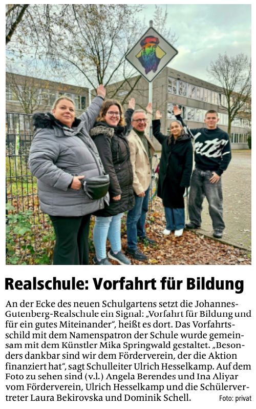 machen es möglich. Gemeinsam mit unseren Schülerinnen und Schülern  hat der Künstler Mika Springwald, wir berichteten, nach den Sommerferien kreativ zusammen gearbeitet. Unter seiner Anleitung wurden verschiedene Bildnisse von Johannes Guteneberg angefertigt. Unteranderem entstand auch dieses Verkehrszeichen.